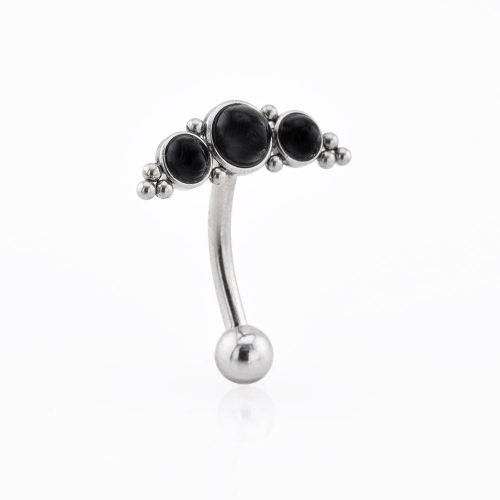 A 1.6mm (14G) surgical steel reverse navel bar with 3 black Onyx stones. Decorated with tribal beads. The bar is 10mm long.