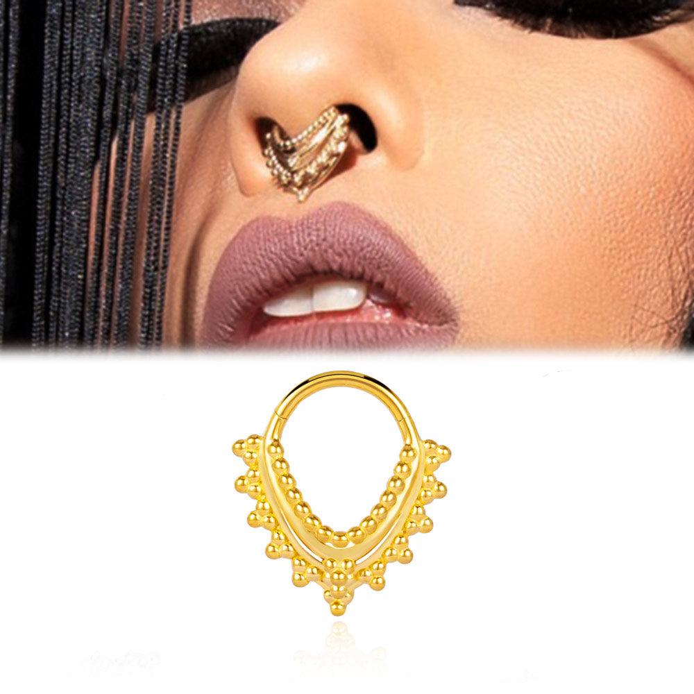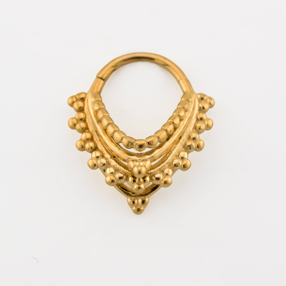 'Shanti' A beautiful 3D Gold 316L surgical steel hinged segment ring in a traditional Rajasthani design. It has 3 flared layers. The ring is at 1.2mm and has an internal diameter of 7mm. It is 16mm long from top to bottom. It securely and easily clicks open and shut.