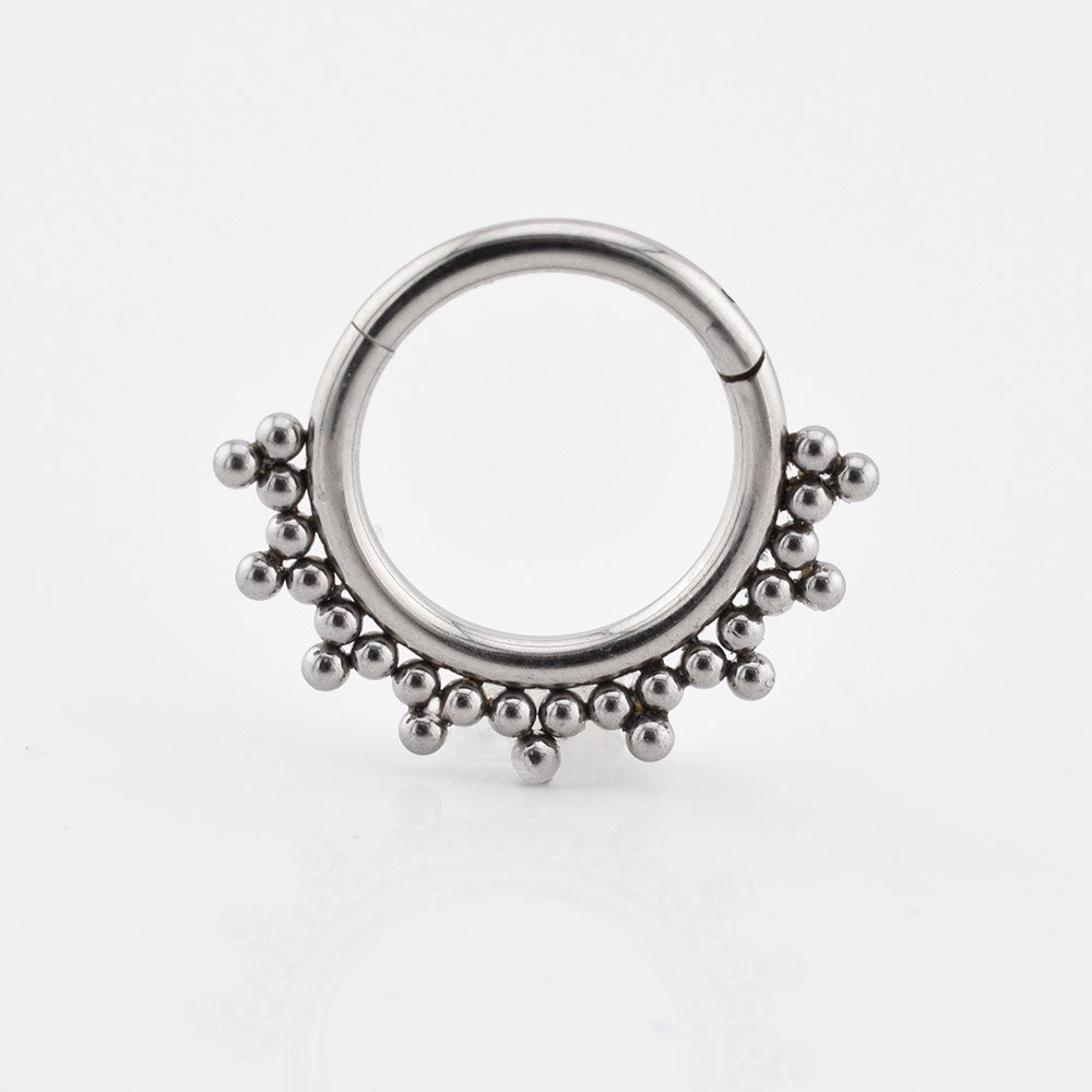 A 1.2mm (16G) hinged segment clicker ring in 316L surgical steel with the traditional tribal beads design. This is available in a very snug 6mm or 8mm diameters. Suitable for a variety of ear piercings including tragus, helix, daith and others.