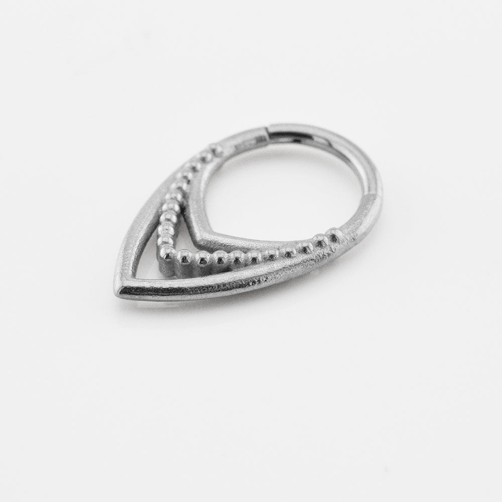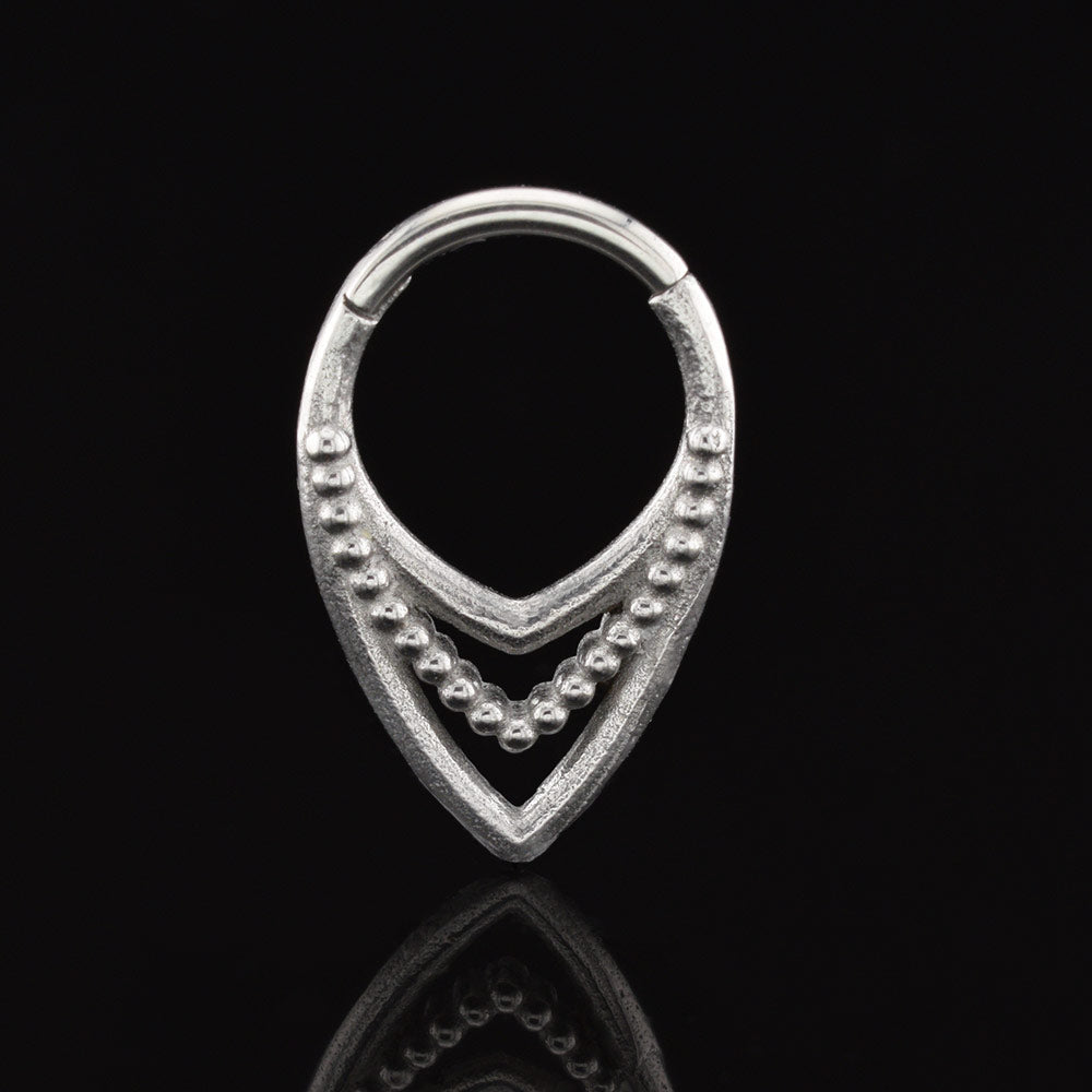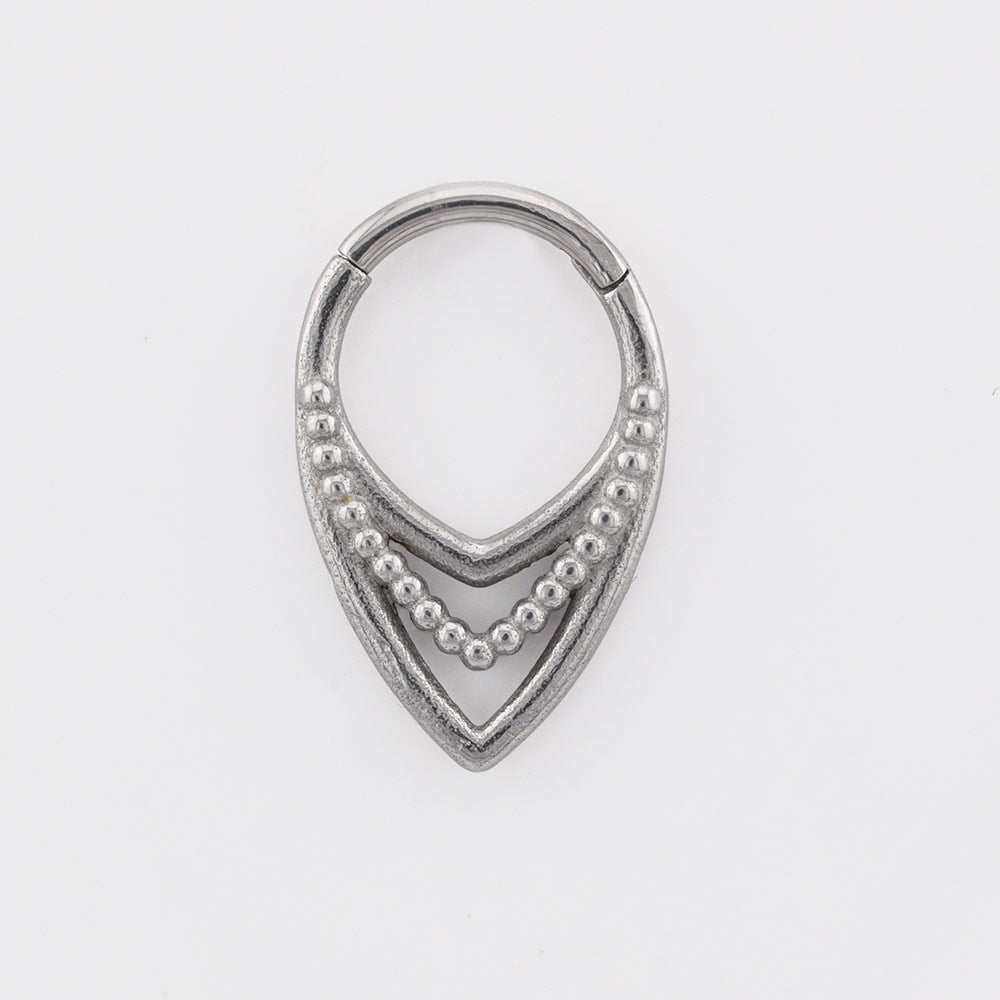'Jana' A triple V shape Clicker ring in surgical steel with the middle section decorated with tribal dot work. The ring is at 1.2mm and has an internal diameter of 8mm. It is 17mm long from top to bottom. It securely and easily clicks open and shut.