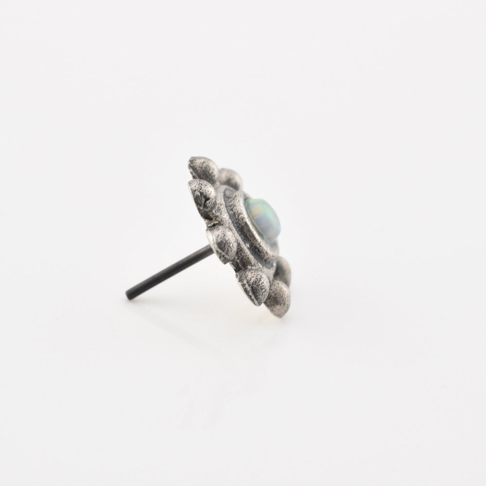 Silver threadless piercing end with opalite stone. The stone is 2mm across and the whole piece is 6mm across.